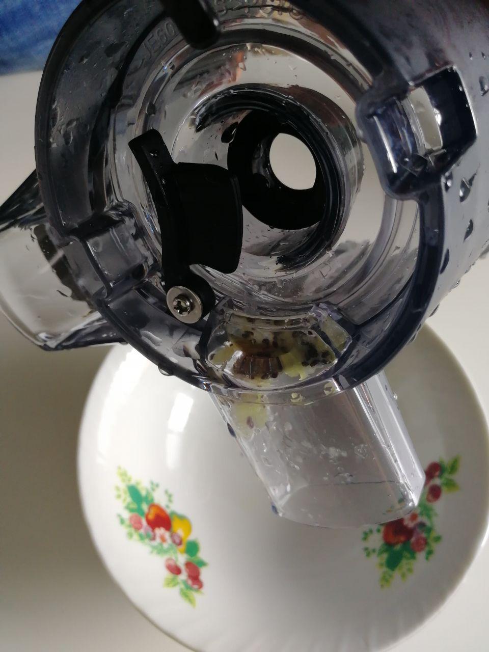 Dettaglio della bocchetta da cui esce lo scarto solido, che finirà nel recipiente dedicato. Anche il sedano, le carote, i ravanelli, la lattuga e gli spinaci permettono un'estrazione di ottimo livello, con una proporzione di succo molto alta rispetto agli scarti, anche confrontando il prodotto con altri modelli concorrenti. Dulcis in fundo, nonostante venga sconsigliato esplicitamente dalle istruzioni, anche alcuni tipi di frutta secca, come le mandorle, vengono agevolmente tritati, producendo un ottimo latte.