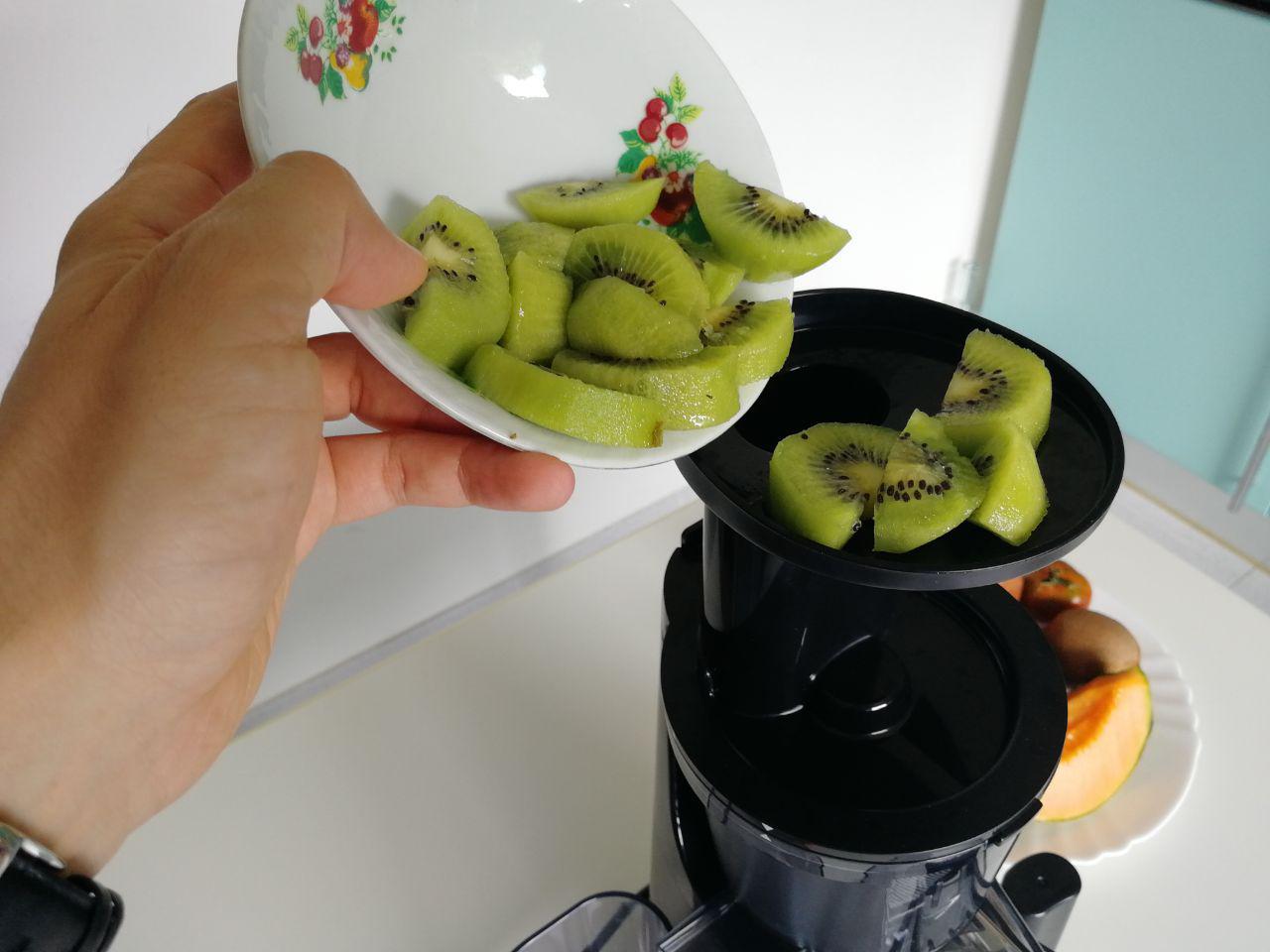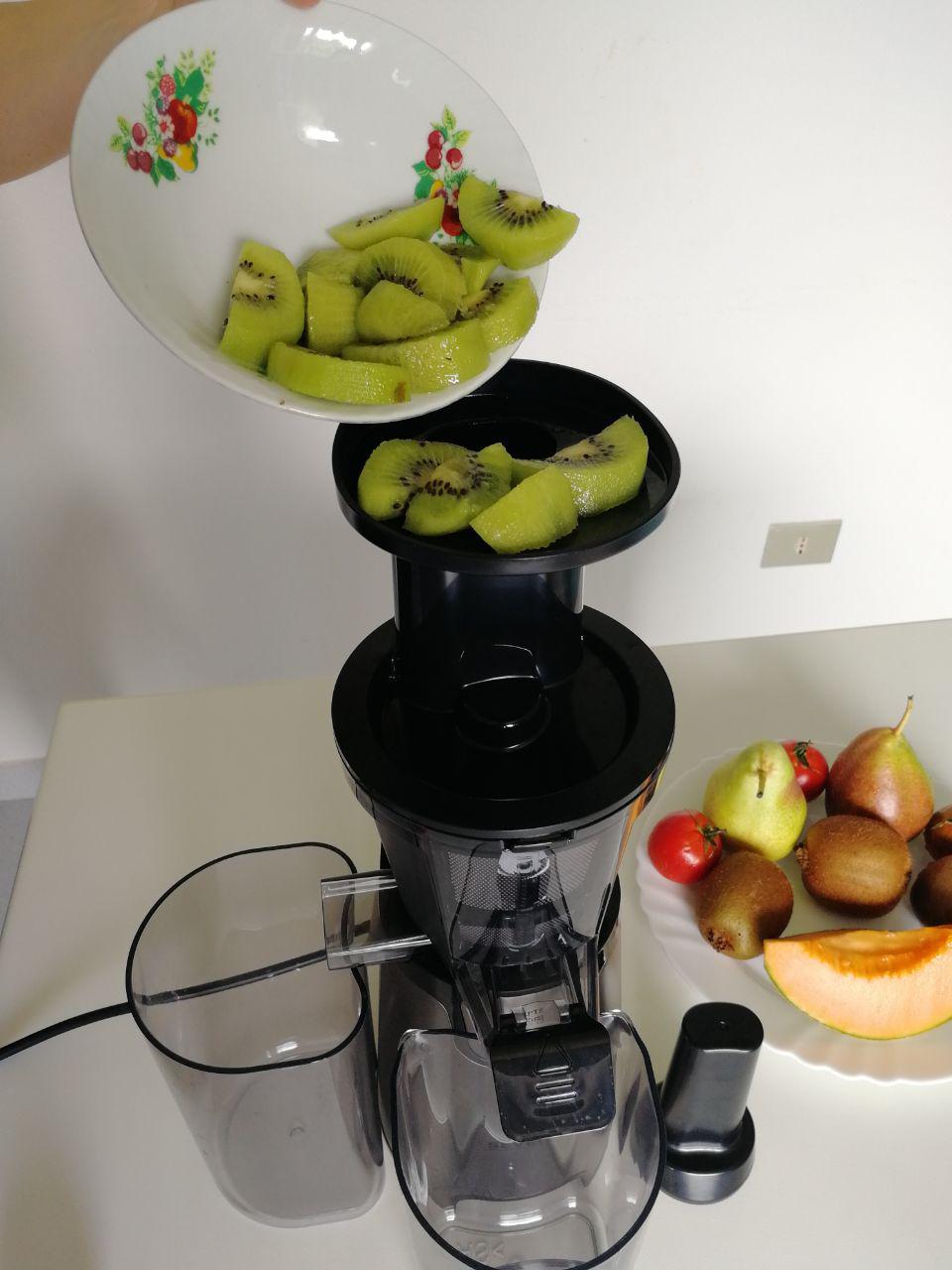 Inserimento della materia prima, una parte può essere disposta nel vano e inserita nel buco man mano. L'estrazione è sicuramente molto agevole e veloce. Anche la frutta e la verdura più fibrosa riescono, seppur con una velocità lievemente inferiore, ad essere estratte perfettamente. Ovviamente col tempo si affina la tecnica per lo specifico estrattore, e imparerete da soli il giusto modo di tagliuzzare i pezzi da inserire all'interno per affaticare in misura minore il motore. In questo caso, tagliuzzare in lungo frutta e verdura, specialmente la più fibrosa, può essere un'ottima tecnica.
