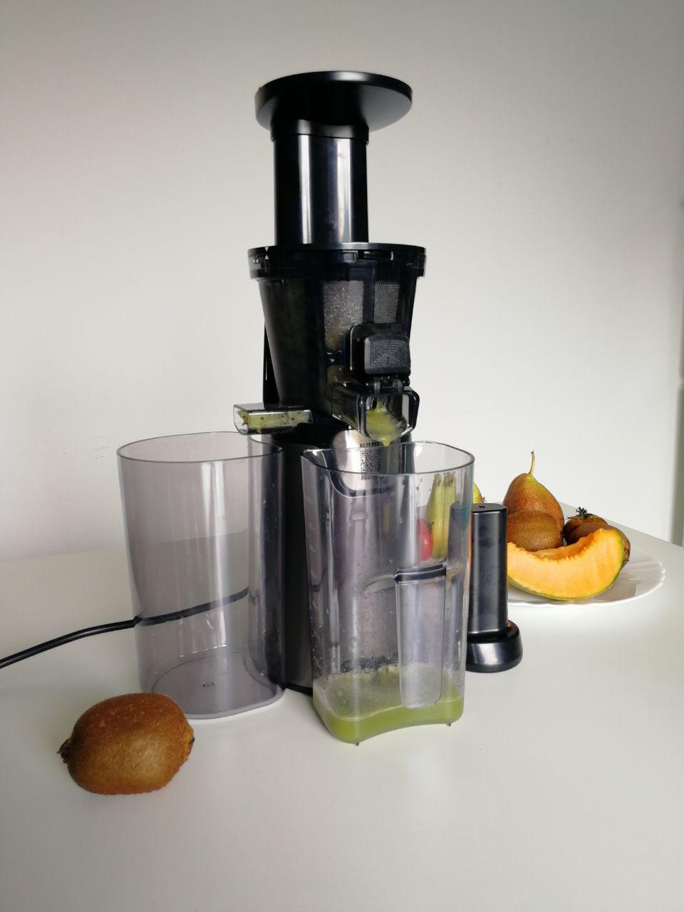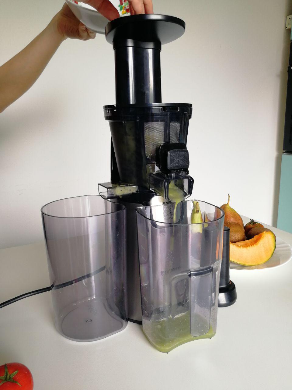 Ricarica dell'estrattore con la frutta già sbucciata e tagliata. Tutta la frutta e la verdura non devono contenere buccia. L'estrattore durante il funzionamento. Nella foto è possibile vedere anche i due recipienti forniti in dotazione, quello per il succo e quello per raccogliere lo scarto. L'estrattore ha quasi finito di estrarre il succo in questa fase, infatti si vede che la bocchetta del succo inizia a non far scendere quasi niente. Ho testato il prodotto con diverse proporzioni di frutta e verdura. In particolare: fragole, mele, pere, kiwi, papaya e mango, in ordine di fibrosità, sono state estratte senza alcuna esitazione. Il consiglio, valido per ogni estrattore a freddo, è ovviamente quello di partire dalla frutta più succosa, per poi passare a quella più ricca di fibre. In questo modo eviterete facilmente gli eventuali inceppamenti che potrebbero verificarsi nella boccuccia di scolo degli scarti.