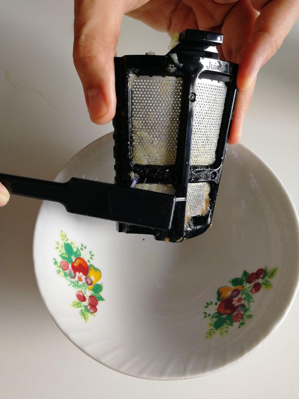 Lo spazzolino viene utilizzato per dare una prima pulita manuale al filtro, per eliminare meglio i residi. Una volta ultimata questa fase si può mettere tutto in lavastoviglie. È importante però ricordarsi, in fase di montaggio, di fissare nuovamente la valvola. Lasciando aperta quest'ultima in fase di funzionamento si andrà a pregiudicare la separazione tra succo e scarti, e si rischierà di sporcare anche la base del prodotto.