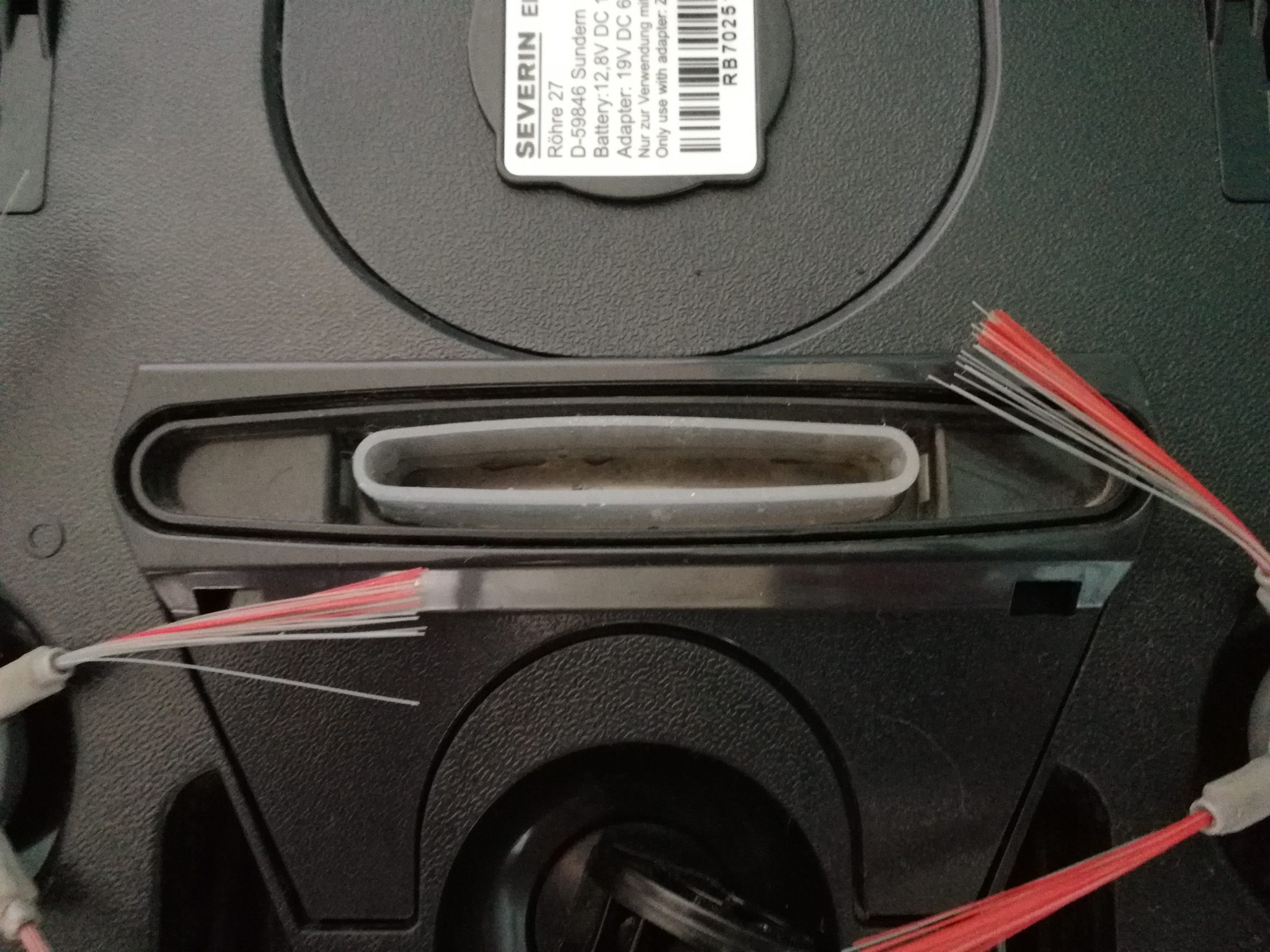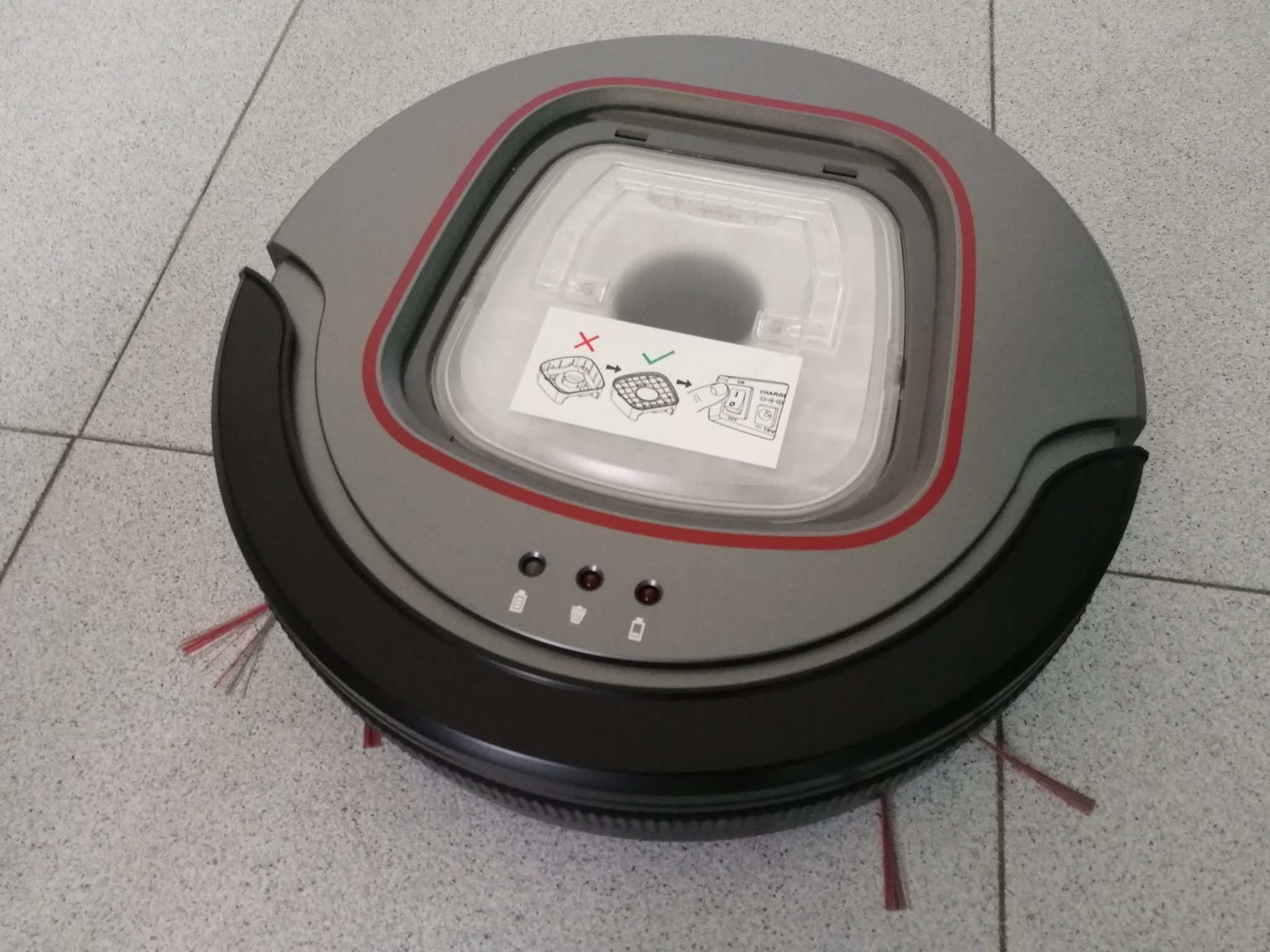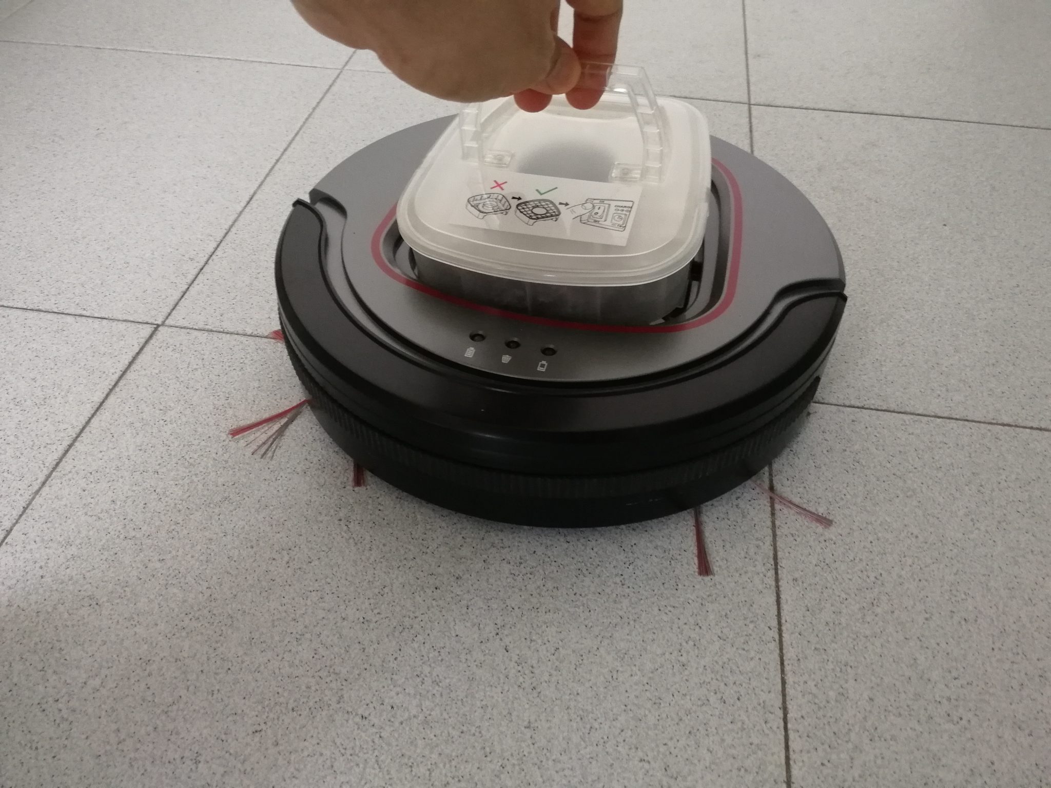Coperchio superiore aperto. In vista il cassetto raccoglipolvere con il filtro. Sempre sulla sommità sono posti i tre led di controllo, che paiono sprecati per le uniche due indicazioni che essi forniscono, ovvero la carica della batteria e l'ostruzione del cassetto. Il tasto di accensione, assieme all'ingresso del jack di ricarica da 19V è posto lateralmente, mentre la superficie inferiore ospita due ruote laterali dal doppio verso di rotazione, e due alloggiamenti per le spazzole. Queste, attraverso il loro movimento rotatorio permettono di convogliare le polveri e lo sporco verso la bocchetta di aspirazione, che pare forse lievemente sottodimensionata, ma proporzionata rispetto alla potenza del motore.