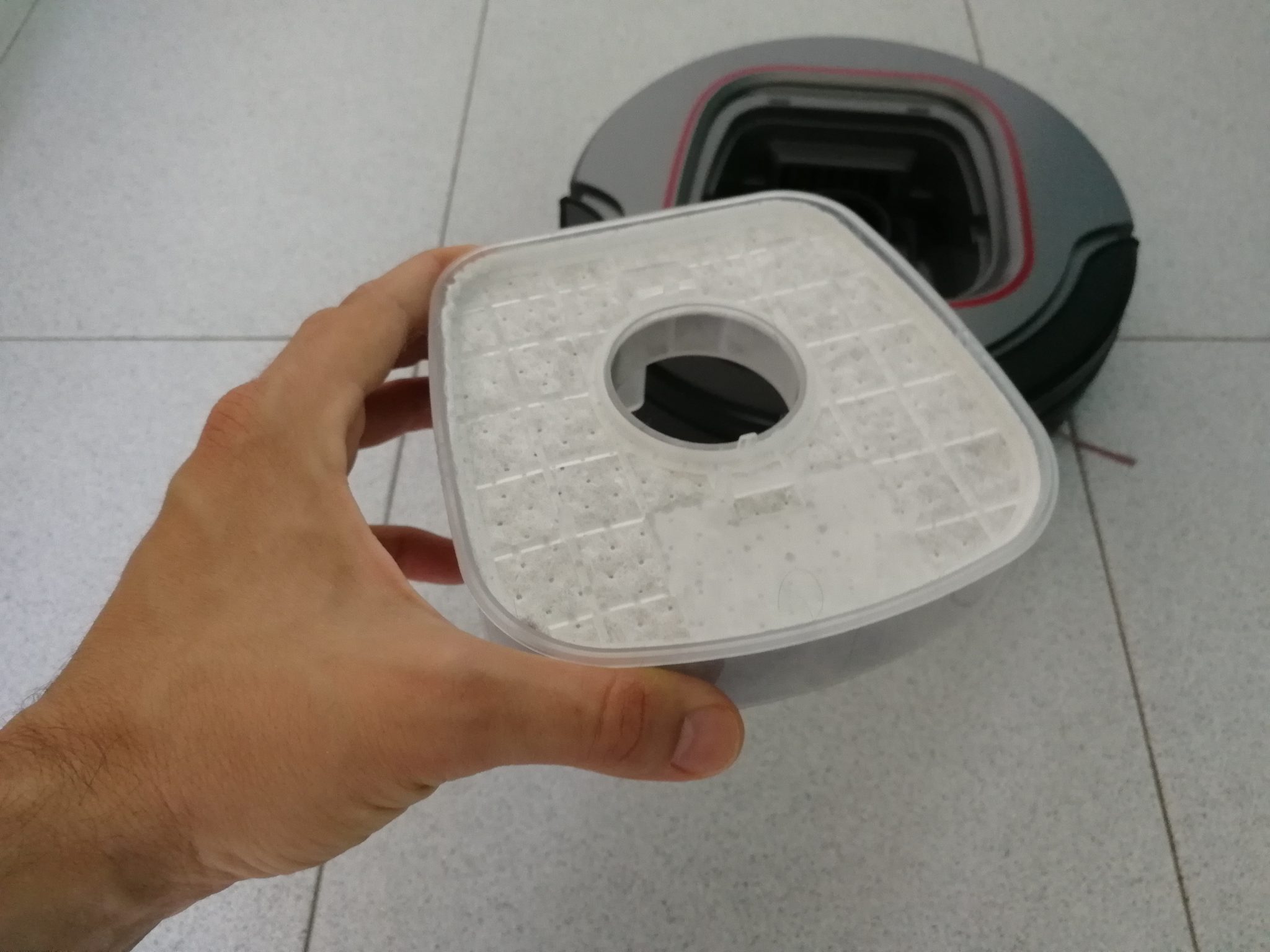 Sensori ottici configurabili attraverso gli switch È molto importante perciò la fase di pre-impostazione della pulizia, che varia a seconda dell'ambiente. Si tratta di un'operazione da pochi secondi, che molti spesso sottovalutano, ma dalla quale dipende la perfetta riuscita della pulizia e la durabilità dell'apparecchio nel tempo. Si dovrà inoltre fare attenzione anche al tipo di superficie da pulire. Nel caso di pavimentazione dura, ad esempio, la pulizia sarà sicuramente più efficace se coadiuvata dalle spazzole, mentre queste dovranno essere rimosse nel caso di tappeti a pelo corto. Dopo l'unboxing sono rimasto piacevolmente sorpreso dalla presenza di due spazzole e di un filtro di ricambio. Questo è un dettaglio non trascurabile, soprattutto per un prodotto di questa fascia di prezzo. Il doppio filtro vi permetterà anche di continuare ad utilizzare il robot anche se uno dei due filtri è in fase di pulizia o di asciugatura.